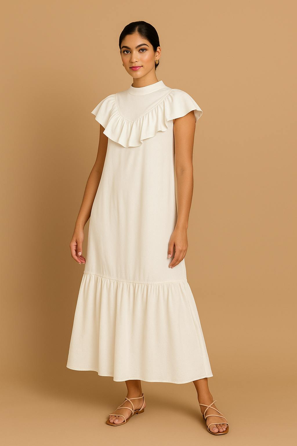 Feito em tecido fluido e de caimento impecável, este vestido transmite serenidade e sofisticação com sua gola delicada e babado estruturado que emoldura o colo com suavidade.